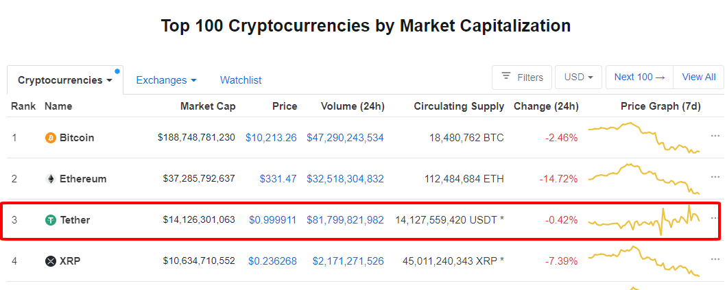 Với tốc độ này, stablecoin đang nhanh chóng chiếm ưu thế trong bối cảnh tiền điện tử do sự áp dụng ngày càng tăng này. Đồng có nhu cầu nhiều nhất, USDT, đang tăng khá nhanh. Nó đã đánh bật XRP khỏi vị trí thứ ba một số lần và mặc dù tạm thời, có vẻ như nó đã trở thành đồng tiền điện tử lớn thứ ba tính theo vốn hóa thị trường.