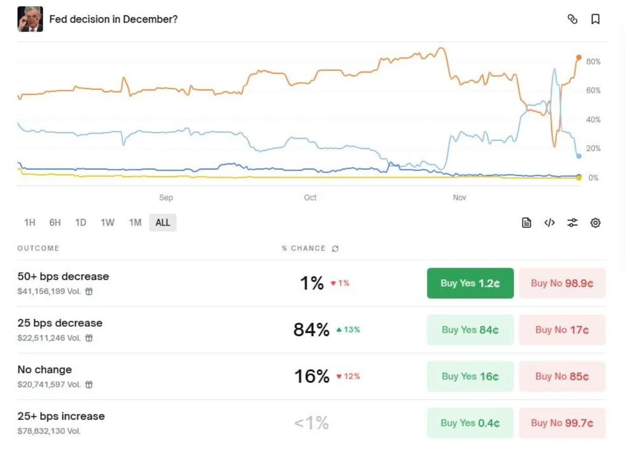 Đồng thời, nền tảng dự đoán Polymarket ghi nhận mức tăng mạnh trong kỳ vọng cắt giảm tháng 12. Xác suất giảm 25 điểm cơ bản đã tăng lên 84%, trong khi khả năng giữ nguyên giảm còn 16%. Dự báo về mức giảm lớn hơn gần như bằng không. Diễn biến này cho thấy thị trường đang nghiêng về một đợt cắt giảm duy nhất trong tháng 12 trước khi Fed tạm dừng để đánh giá kinh tế.