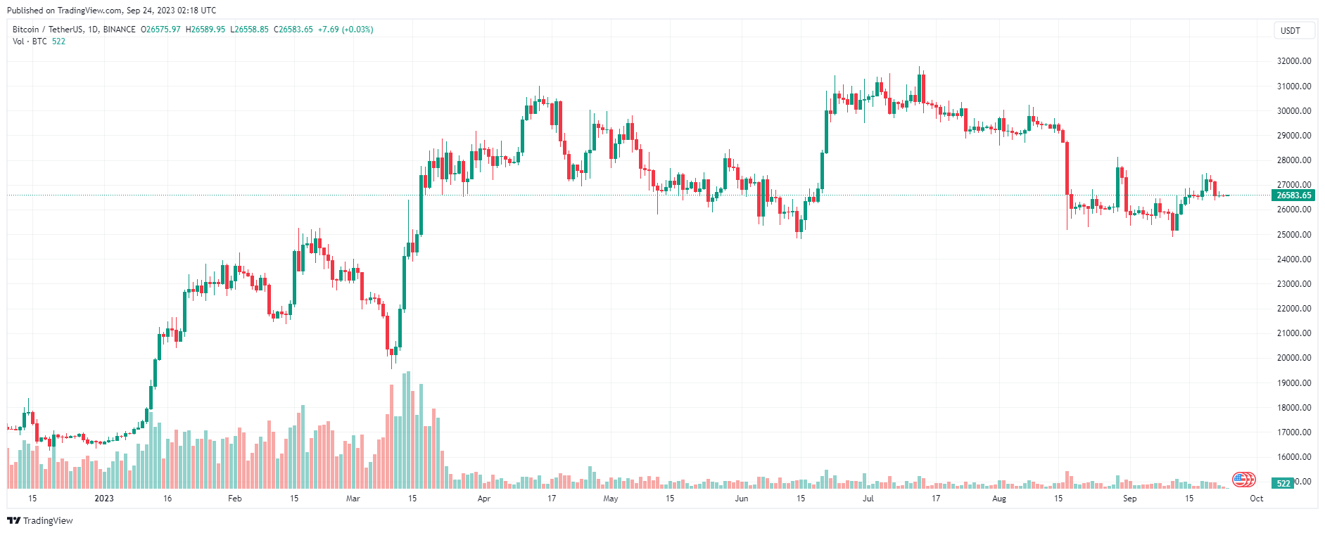 Tuy nhiên, đà hồi phục này không thể duy trì được lâu, với việc giá BTC quay đầu giảm về dưới $ 26.500 sau khi Cục dự trữ liên bang Mỹ (Fed) quyết định giữ lãi suất ổn định trong cuộc họp tháng 9 nhưng báo hiệu sẽ còn thêm một đợt nâng lãi suất khác trong năm nay.