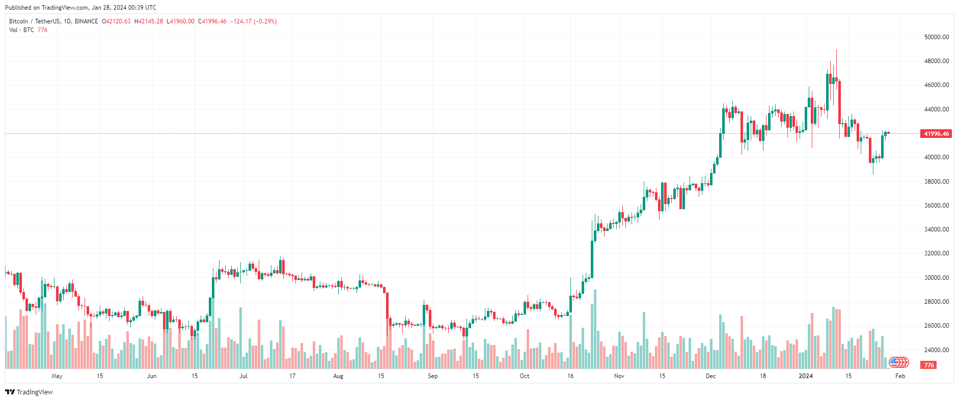 Sau đó, người mua đã bước vào thị trường, kích hoạt đợt phục hồi mạnh mẽ, đẩy giá BTC quay về quanh $ 42.000 vào ngày 26/01 và tiếp tục nỗ lực đòi lại khu vực này trong những ngày sau đó.