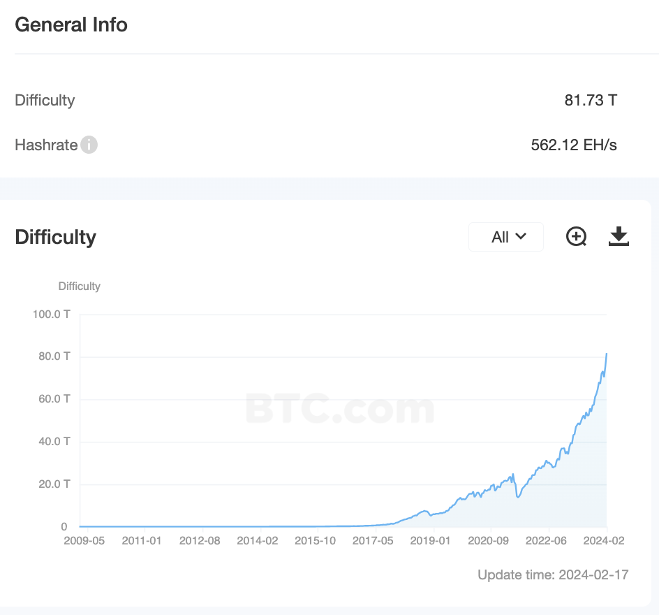 Hashrate của mạng, đo lường tổng công suất tính toán do các thợ đào sử dụng, đã tăng lên 562,12 EH/s với độ khó khai thác đạt 81,73 nghìn tỷ – mức cao mới mọi thời đại, theo trình thám hiểm blockchain BTC.com. Với mức tăng ổn định kể từ tháng 1 năm 2023, độ khó khai thác Bitcoin đang trên đà đạt tới 100 nghìn tỷ trong những tháng tới.