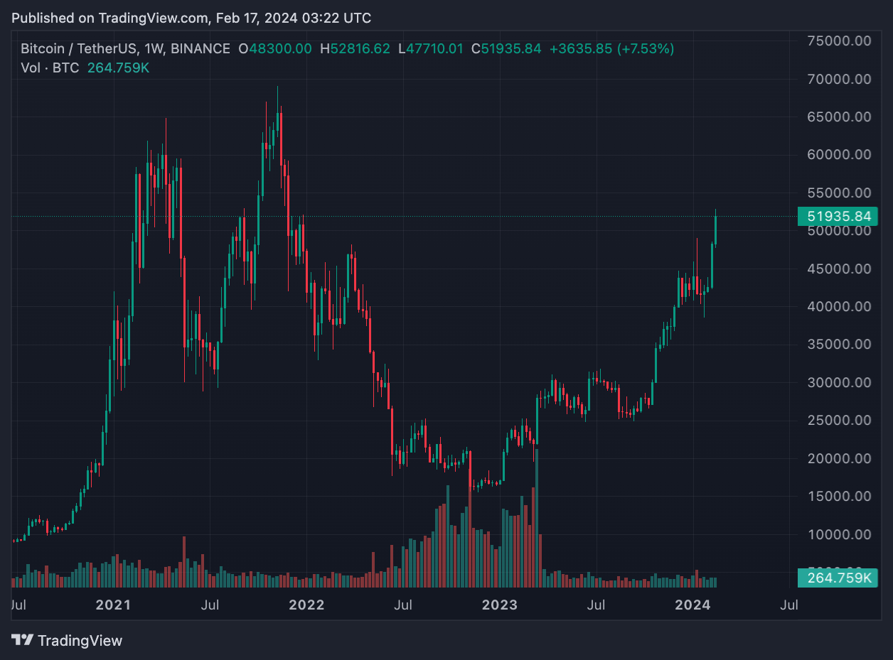 Giá Bitcoin đạt 51.935 USD vào thời điểm viết bài. Lần cuối cùng giá Bitcoin cao như vậy là vào tháng 11 năm 2021.