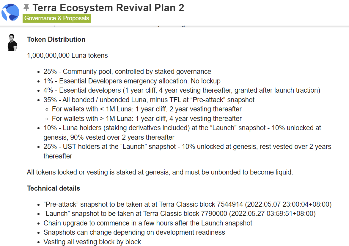 Kwon nhấn mạnh rằng việc duy trì hệ sinh thái nhà phát triển Terra là điều quan trọng nhất và đã tweet rằng “Terra còn hơn cả UST”. Theo kế hoạch của anh, 5% nguồn cung LUNA mới sẽ được phân bổ cho “các nhà phát triển thiết yếu”. Cụ thể: