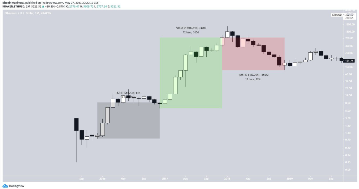 ETH đã tăng giá mạnh nhất vào năm 2017, trong khi năm giảm giá nhiều nhất lại là năm 2019.