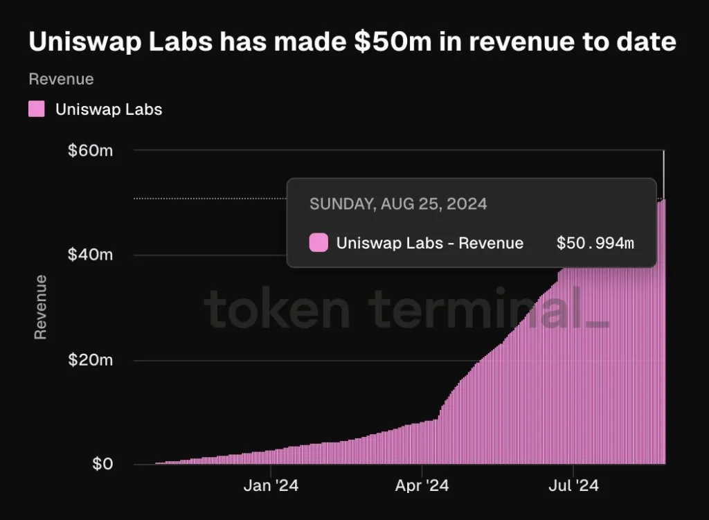 Dù UNI còn cách xa mức đỉnh mọi thời đại, với mức giảm gần 85% so với đỉnh năm 2021, một số phát triển tích cực có thể giúp giá token phục hồi trong dài hạn. Theo dữ liệu từ Token Terminal, Uniswap Labs đã tạo ra hơn $50 triệu doanh thu giao diện cho đến nay.