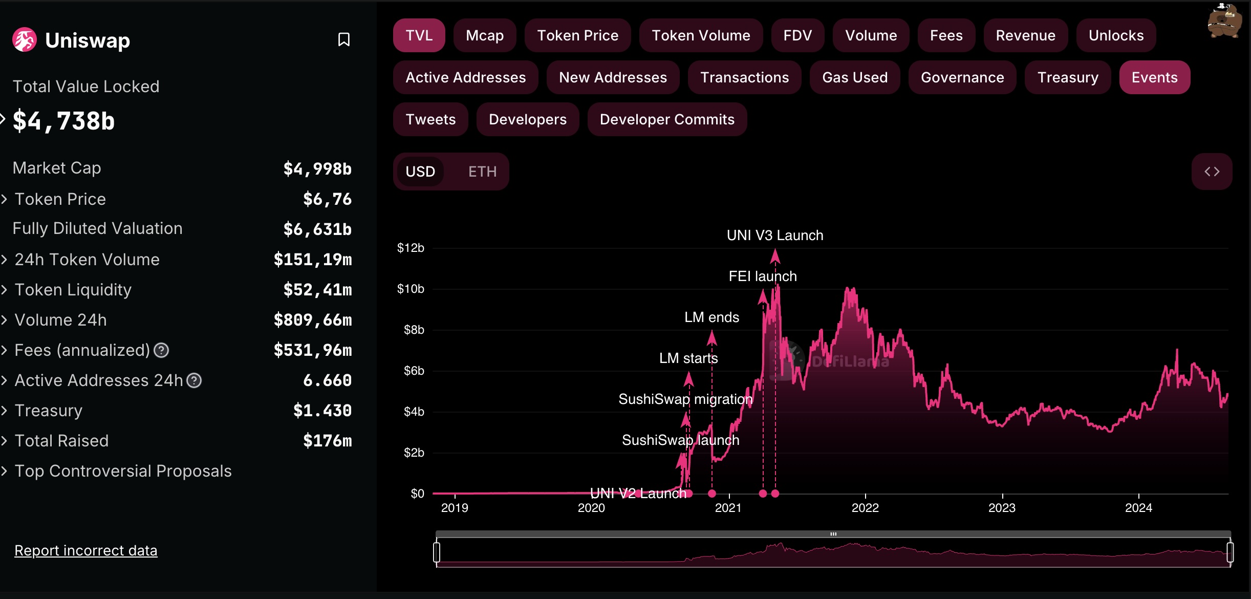 Nhờ các lợi thế vượt trội, Uniswap đã mở rộng khối lượng tài sản quản lý lên hơn $4,738 tỷ, theo DeFiLlama. Tính đến ngày 27 tháng 8, Uniswap đã có mặt trên hơn mười nền tảng, trong đó riêng trên Ethereum, giao thức này đang quản lý hơn $3,8 tỷ.