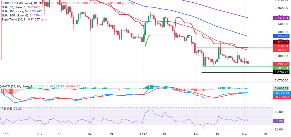 Về các mốc quan trọng, hỗ trợ gần nhất nằm tại đáy cuối tuần quanh 0,088 USD. Nếu ngưỡng này bị xuyên thủng, giá có thể lùi về vùng xoay chiều đầu tháng 2 quanh 0,080 USD. Ở chiều ngược lại, mốc 0,093 USD đóng vai trò kháng cự tức thời. Chỉ khi đóng cửa ngày vượt ngưỡng này, Dogecoin mới có cơ hội nới lỏng áp lực bán, hướng tới EMA 50 ngày tại 0,107 USD và xa hơn là EMA 100 ngày quanh 0,125 USD.