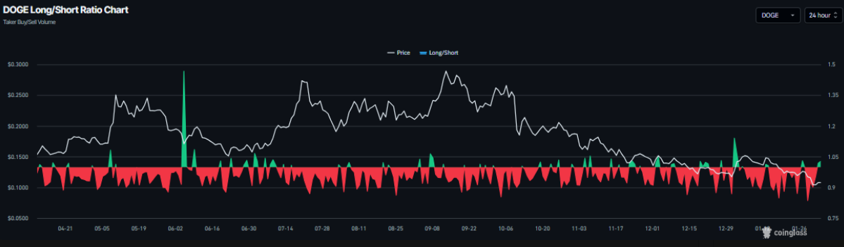 Ở thị trường phái sinh, tỷ lệ long/short của DOGE trên Coinglass đạt 1,02 vào thứ Ba. Việc tỷ lệ này duy trì trên ngưỡng 1 phản ánh tâm lý nghiêng về các vị thế mua, cho thấy giới giao dịch đang đặt cược vào kịch bản giá tăng và qua đó có thể tạo thêm lực đỡ cho đà hồi phục của DOGE.