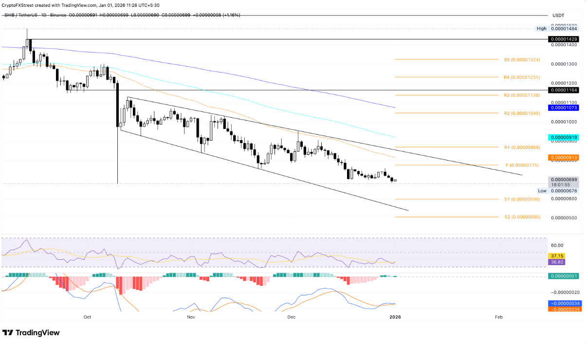 Shiba Inu hiện vẫn vận động trong xu hướng giảm, bị kìm hãm bên trong mô hình cái nêm mở rộng – thể hiện rõ qua hai đường xu hướng phân kỳ trên biểu đồ ngày. Tại thời điểm viết bài, SHIB ghi nhận mức tăng nhẹ khoảng 1% trong phiên thứ Năm, qua đó hồi phục sau cú điều chỉnh 2,68% của phiên trước.