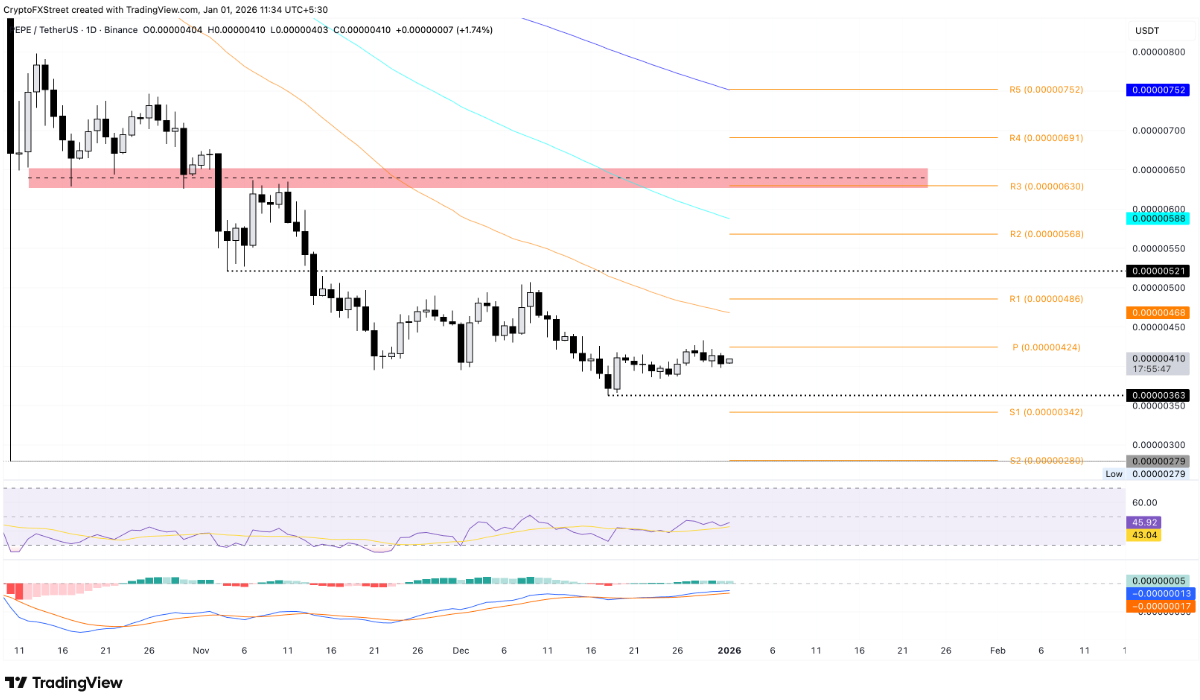 Pepe ghi nhận mức tăng hơn 1% trong phiên giao dịch ngày thứ Năm, đánh dấu sự phục hồi sau khi giảm 2,66% vào ngày thứ Tư trước đó. Đà hồi phục này cho thấy lực mua đang quay trở lại với meme coin lấy chủ đề chú ếch. Trong trường hợp xu hướng tăng được duy trì, vùng Pivot R1 tại 0,00000424 USD sẽ đóng vai trò là ngưỡng kháng cự quan trọng mà giá cần vượt qua để xác nhận động lực đi lên.