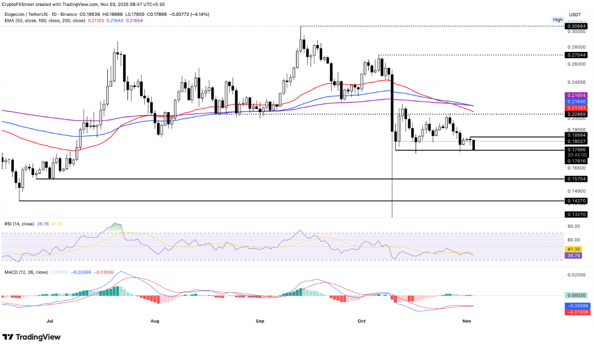 Dogecoin (DOGE) tiếp tục chịu áp lực bán mạnh, giảm hơn 4% trong phiên giao dịch thứ Hai và rơi xuống dưới mốc 0,18000 USD. Lực mua đang nỗ lực bảo vệ vùng hỗ trợ quan trọng tại 0,17816 USD — mức đáy từng được thiết lập vào ngày 11/10.