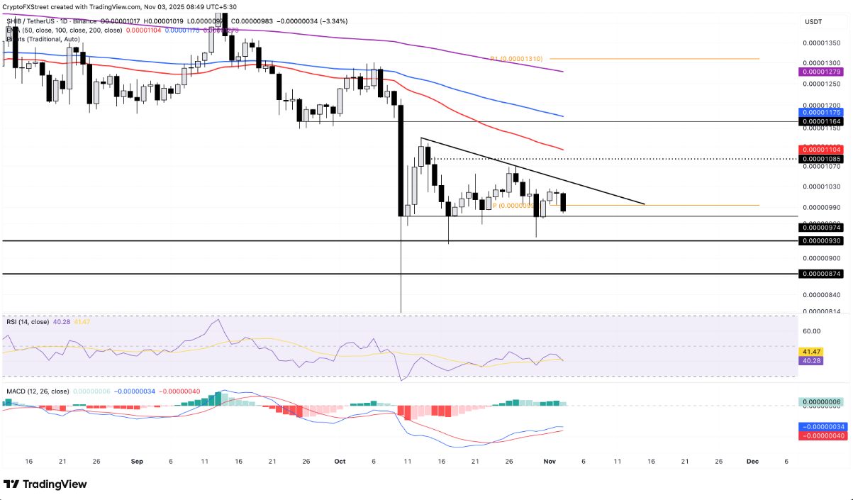 Shiba Inu (SHIB) đã đánh mất mốc tâm lý quan trọng 0,00001000 USD, mở đầu tuần mới với tâm lý bi quan bao trùm thị trường. Tại thời điểm viết bài, SHIB giảm hơn 3%, đe dọa xuyên thủng vùng hỗ trợ 0,00000974 USD — mức đóng cửa được ghi nhận vào ngày 10/10.