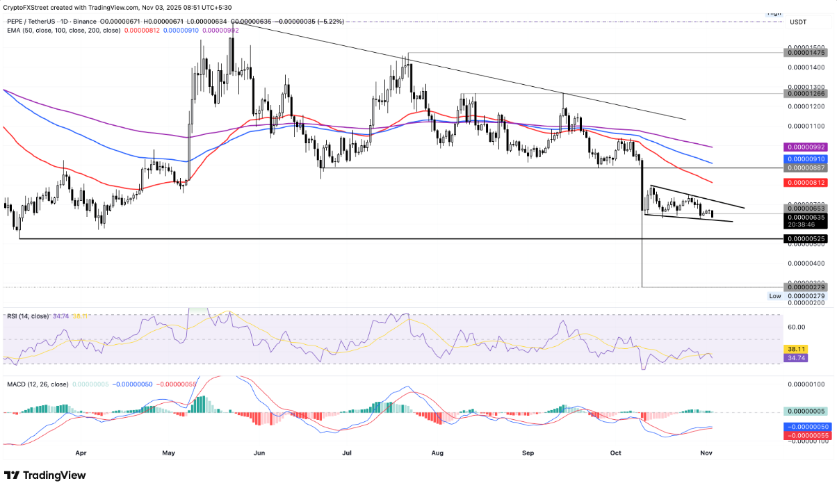 Pepe (PEPE) tiếp tục giảm thêm 5% trong phiên giao dịch thứ Hai, khi lực cầu từ cả nhà đầu tư nhỏ lẻ lẫn cá voi đều suy yếu rõ rệt. Meme coin này hiện đang tiến sát vùng hỗ trợ xu hướng quanh 0,00000620 USD — khu vực được hình thành từ hai đáy quan trọng ngày 11/10 và 30/10.