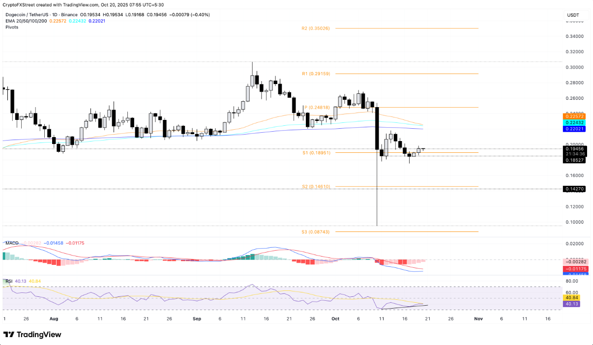 Tính đến chiều thứ Hai, Dogecoin (DOGE) vẫn giữ vững trên mốc 0,19000 USD, hoàn tất hai phiên tăng liên tiếp với mức lợi nhuận khoảng 5%. Động lực phục hồi này đang đưa DOGE tiến sát ngưỡng tâm lý 0,20000 USD, sau khi bật mạnh từ vùng hỗ trợ 0,18527 USD được thiết lập hôm 11/10.