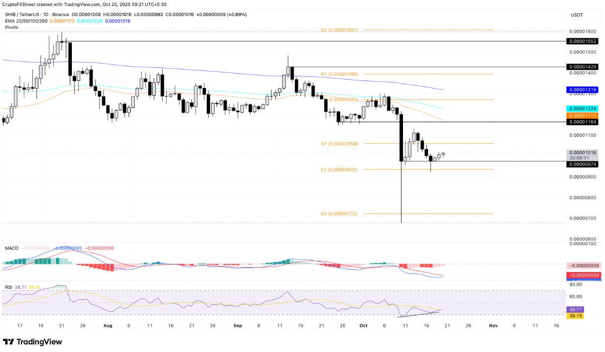Tại thời điểm viết bài, Shiba Inu (SHIB) đang giao dịch trên ngưỡng tâm lý 0,00001000 USD, ghi nhận phiên phục hồi thứ ba liên tiếp. Đà bật mạnh từ vùng hỗ trợ 0,00000974 USD (xác lập ngày 11/10) cho thấy mô hình vận động của SHIB đang tái hiện xu hướng tương tự như Dogecoin (DOGE).