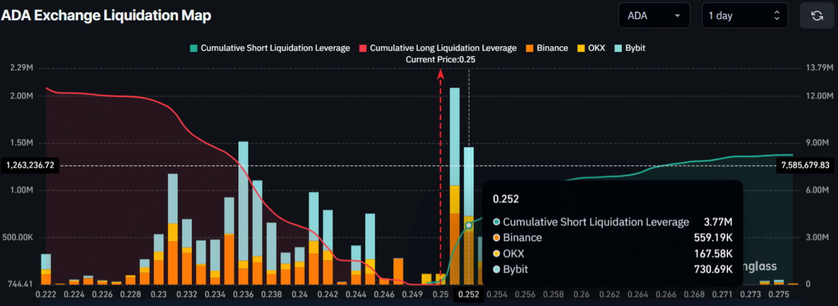 Trong ngày, hai mốc then chốt được xác định tại 0,236 USD (hỗ trợ) và 0,252 USD (kháng cự) – những vùng giá thu hút hoạt động giao dịch sôi động từ các trader ngắn hạn. Tại đây, thị trường đã tích lũy khoảng 9,25 triệu USD vị thế long và 3,77 triệu USD vị thế short, tạo nên các cụm thanh khoản mà ADA đang dần tiếp cận.