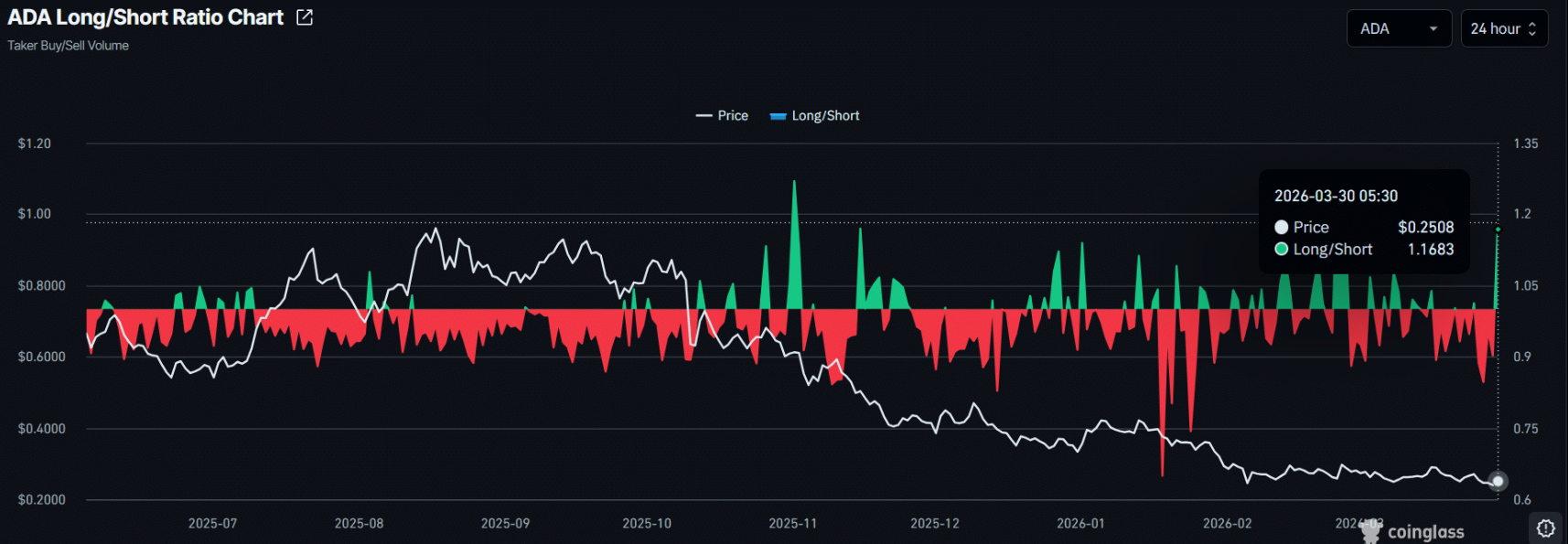 Đáng chú ý, CoinGlass cũng ghi nhận tỷ lệ Long/Short của ADA đã chạm mức 1,16 – cao nhất trong vòng một tháng – phản ánh sự áp đảo của tâm lý lạc quan. Nói cách khác, số lượng trader đặt cược vào kịch bản tăng giá đang vượt trội so với phe kỳ vọng giảm.