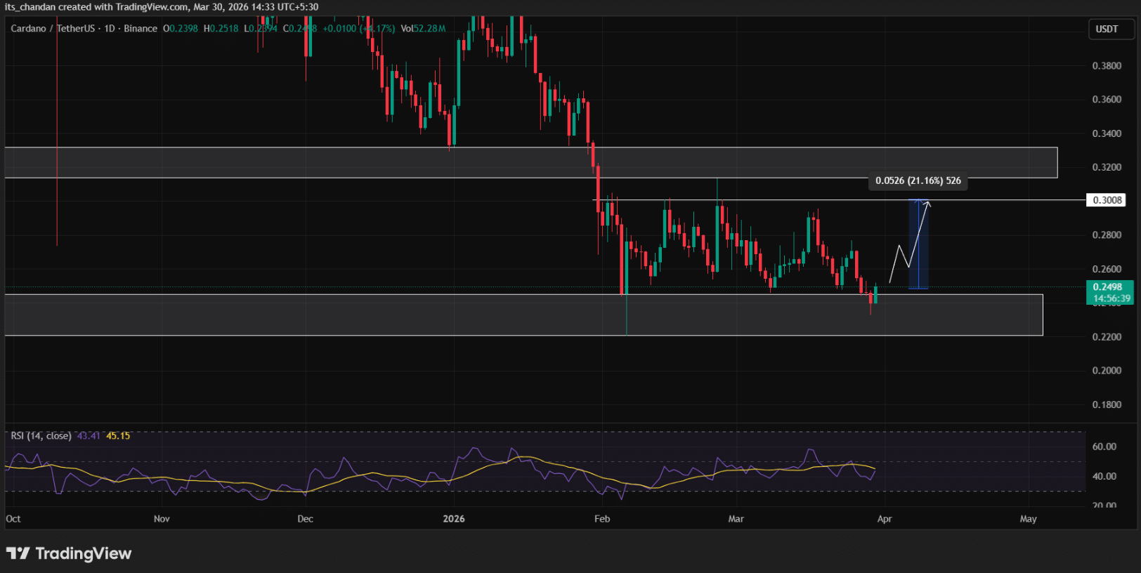 Biểu đồ ngày cho thấy ADA đã kiểm tra thành công vùng hỗ trợ quan trọng tại 0,235 USD — mốc giá được duy trì ổn định từ tháng 1/2021.