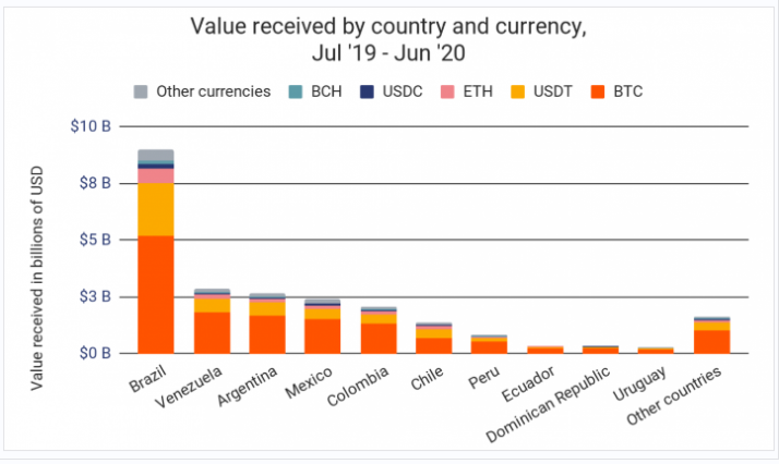 Nghiên cứu của Chainalysis đã xếp Argentina là quốc gia có giá trị tiền điện tử cao thứ ba tính từ tháng 7 năm 2019 đến tháng 6 năm 2020, khoảng 3 tỷ đô la.