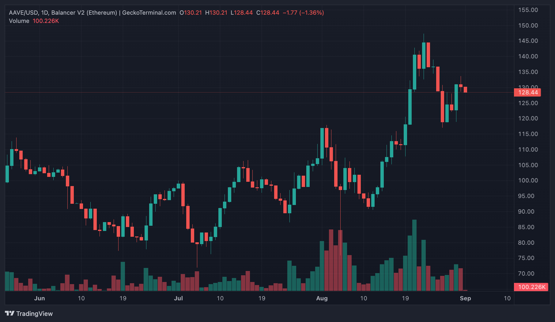 AAVE, loại tiền điện tử gốc của giao thức Aave Finance, đã phản ứng với động thái này của người sáng lập Ethereum. Trong vòng chưa đầy 20 giờ, giá của nó đã tăng từ 118 đô la lên 133 đô la, đạt mức cao nhất trong tuần trước khi thoái lui về 128 đô la.