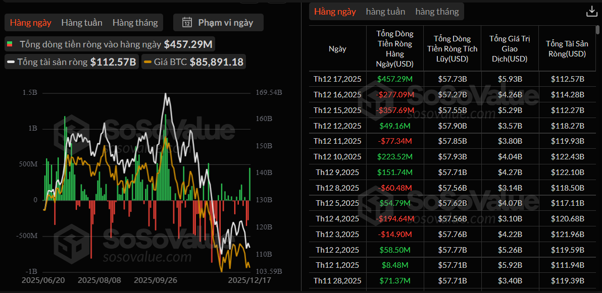 Theo dữ liệu từ SoSoValue, các quỹ ETF Bitcoin giao ngay tại Mỹ đã ghi nhận dòng vốn vào mạnh mẽ trong ngày 17/12 (giờ ET), với tổng dòng tiền ròng đạt khoảng 457 triệu USD. Trong đó, ETF Bitcoin giao ngay của Fidelity (FBTC) dẫn đầu thị trường khi thu hút tới 391 triệu USD chỉ trong một ngày, cho thấy nhu cầu của nhà đầu tư tổ chức đối với Bitcoin thông qua các sản phẩm đầu tư được quản lý vẫn rất lớn.