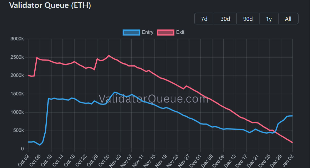 Trong khi đó, hàng chờ gia nhập mạng lưới validator của Ethereum đã bất ngờ đảo chiều tăng mạnh sau gần hai tháng lao dốc liên tiếp. Lượng ETH chờ staking vọt lên khoảng 120%, từ mức đáy 410.938 ETH ghi nhận ngày 28/12 lên 904.051 ETH vào thứ Sáu, phản ánh xu hướng ngày càng nhiều nhà đầu tư sẵn sàng khóa tài sản để tham gia bảo mật mạng lưới.