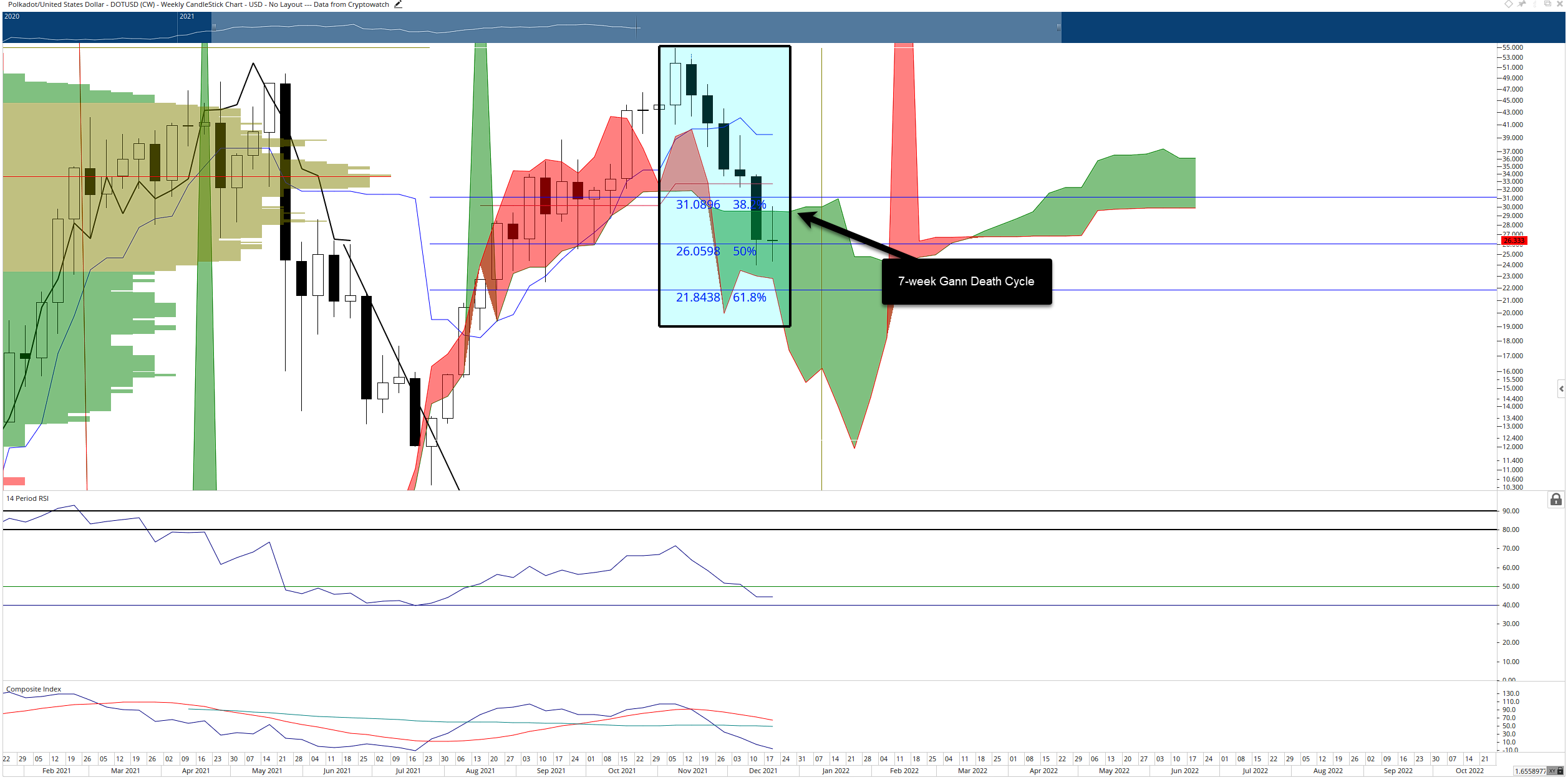 Giá DOT đang ở tuần thứ sáu liên tiếp tạo ra các nến tuần có giá đóng cửa thấp hơn giá mở. Đây cũng là cây nến hàng tuần thứ bảy trong động thái điều chỉnh này. Trong Phân tích Gann, WD Gann đã viết rằng ông coi việc di chuyển trong 49 đến 52 ngày theo một hướng duy nhất là một ‘khu vực tử thần’. Gann cho biết các công cụ đáp ứng các tiêu chí ‘chu kỳ chết chóc’ của ông có khả năng rất cao đảo ngược xu hướng hoặc điều chỉnh xu hướng rộng hơn.