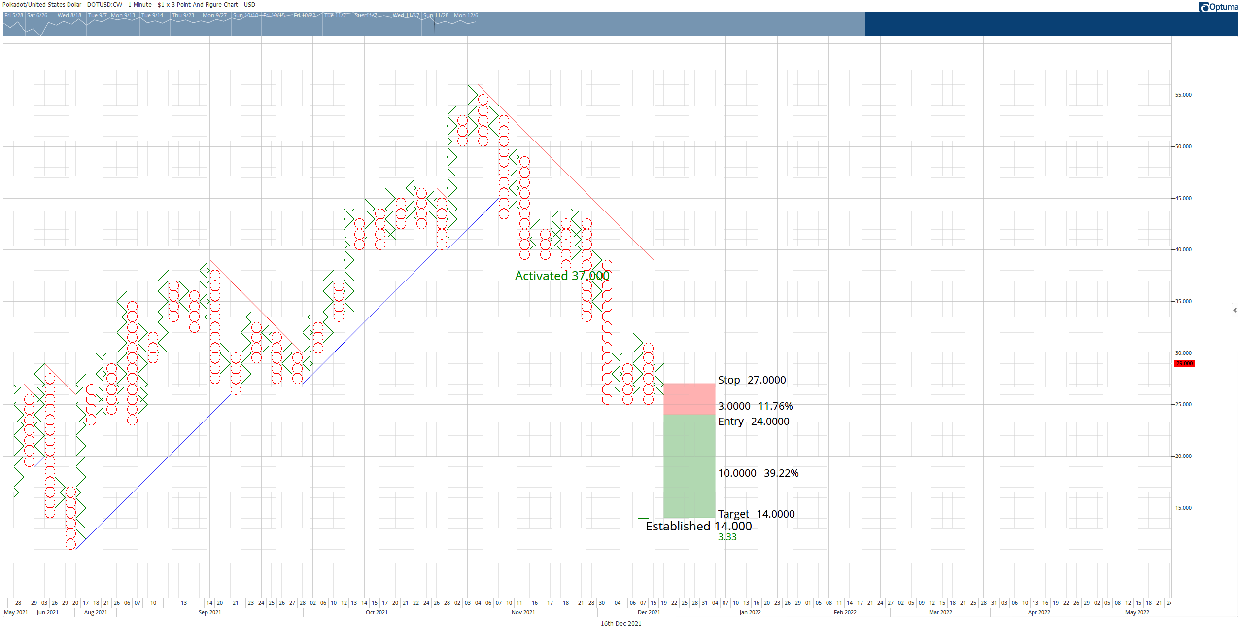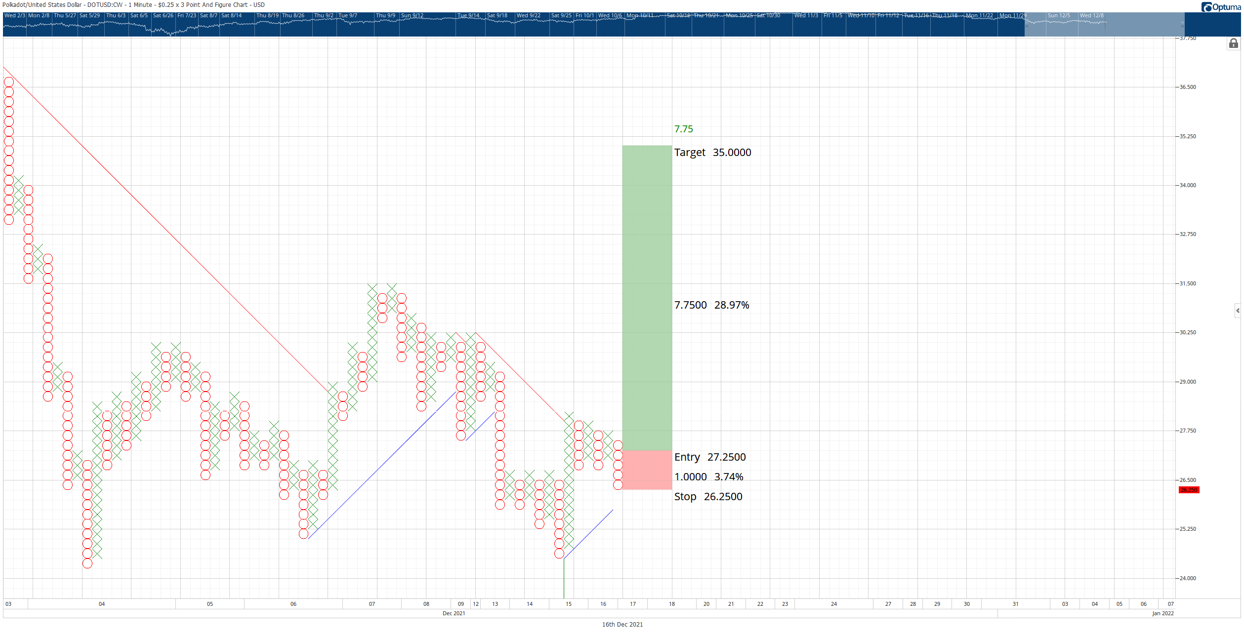 Thiết lập giao dịch lý thuyết cho DOT là dừng mua ở mức $ 27,25, stop loss ở mức $ 26,25 và mục tiêu lợi nhuận là $ 35. Giao dịch này đại diện cho tỷ lệ phần thưởng/ rủi ro là 7,75: 1. Giao dịch này hợp lệ nếu cột O hiện tại không giảm xuống dưới $ 25,75. Điểm dừng ba ô sẽ giúp bảo vệ bất kỳ lợi nhuận ngụ ý nào sau khi nhập.