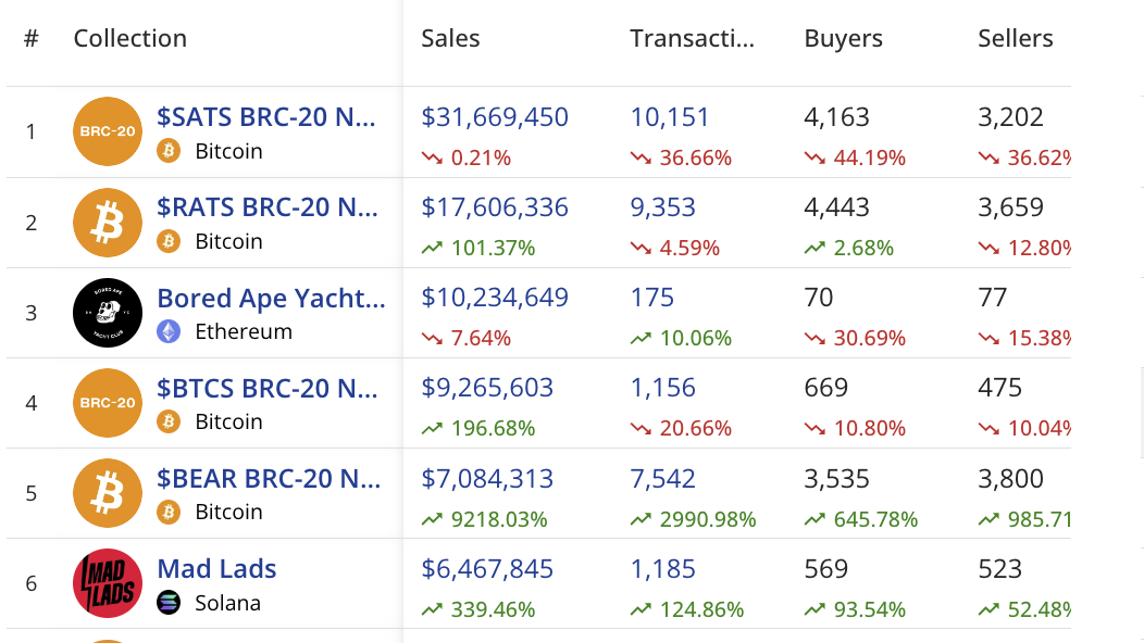 Mad Lads đã đăng ký khối lượng giao dịch lớn thứ 6 trong số các dự án NFT trong tuần qua, theo dữ liệu từ CryptoSlam, với giao dịch trị giá khoảng 6,4 triệu đô la. Trong khi đó, DeGods đã kiếm được gần 1,4 triệu đô la trong suốt thời gian đó.