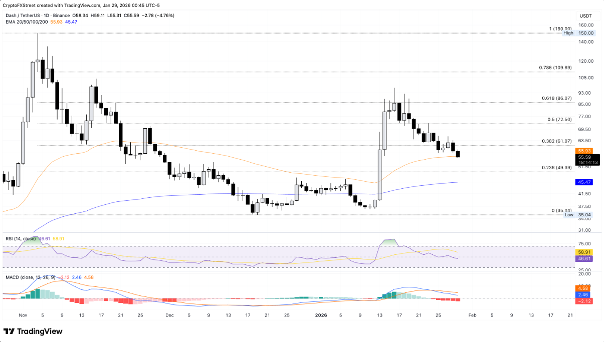 Ở chiều ngược lại, nếu DASH có thể đóng cửa ngày trên đường EMA 50 ngày tại 55,93 USD, áp lực giảm ngắn hạn sẽ phần nào được xoa dịu, mở ra khả năng giá phục hồi lên vùng Fibonacci thoái lui 38,2% quanh 61,07 USD.