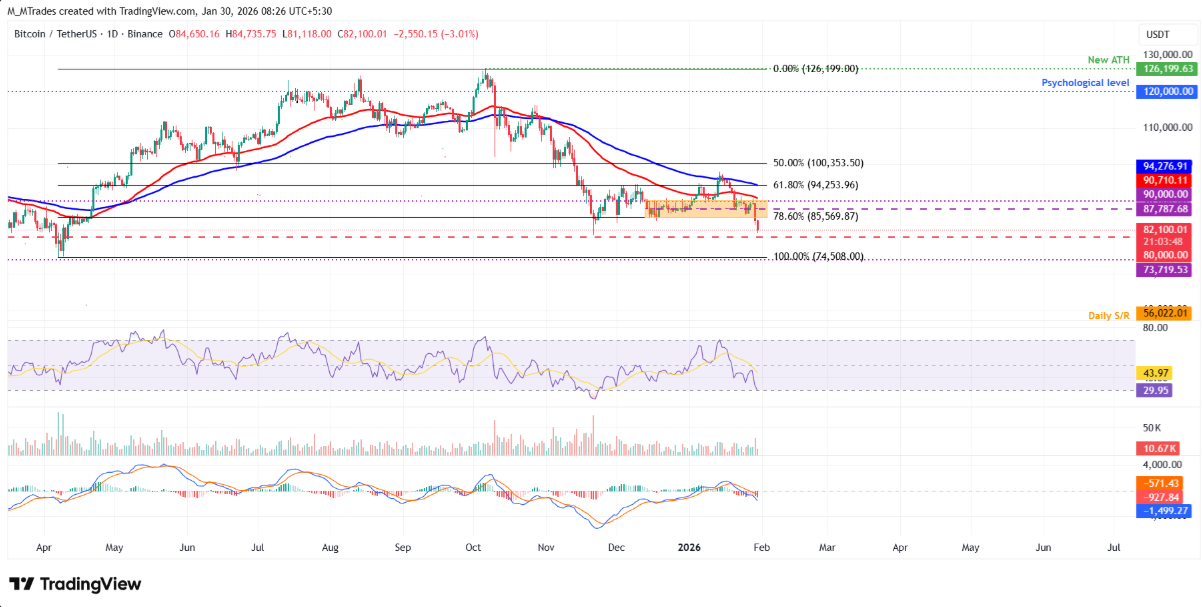Trong kịch bản tiêu cực, nếu đà giảm chưa dừng lại, BTC có thể mở rộng nhịp điều chỉnh về vùng đáy hình thành trong tháng 11 tại 80.600 USD. Việc xuyên thủng và đóng cửa dứt khoát dưới mốc hỗ trợ này sẽ làm gia tăng rủi ro giá trượt sâu hơn về đáy ngày 7/4 — cũng là mức thấp nhất kể từ đầu năm 2025 — tại 74.508 USD.