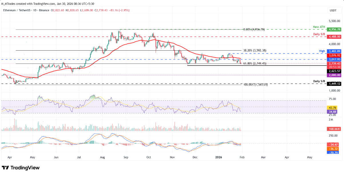 Về mặt kỹ thuật, việc ETH đóng cửa dưới mức Fibonacci thoái lui 61,8% tại 2.749 USD trên khung ngày có thể kích hoạt một nhịp giảm sâu hơn, với mục tiêu trước mắt là đáy ngày 21/11 tại 2.623 USD. Nếu mốc hỗ trợ này không trụ vững, áp lực bán nhiều khả năng sẽ kéo giá về ngưỡng tâm lý quan trọng 2.000 USD.