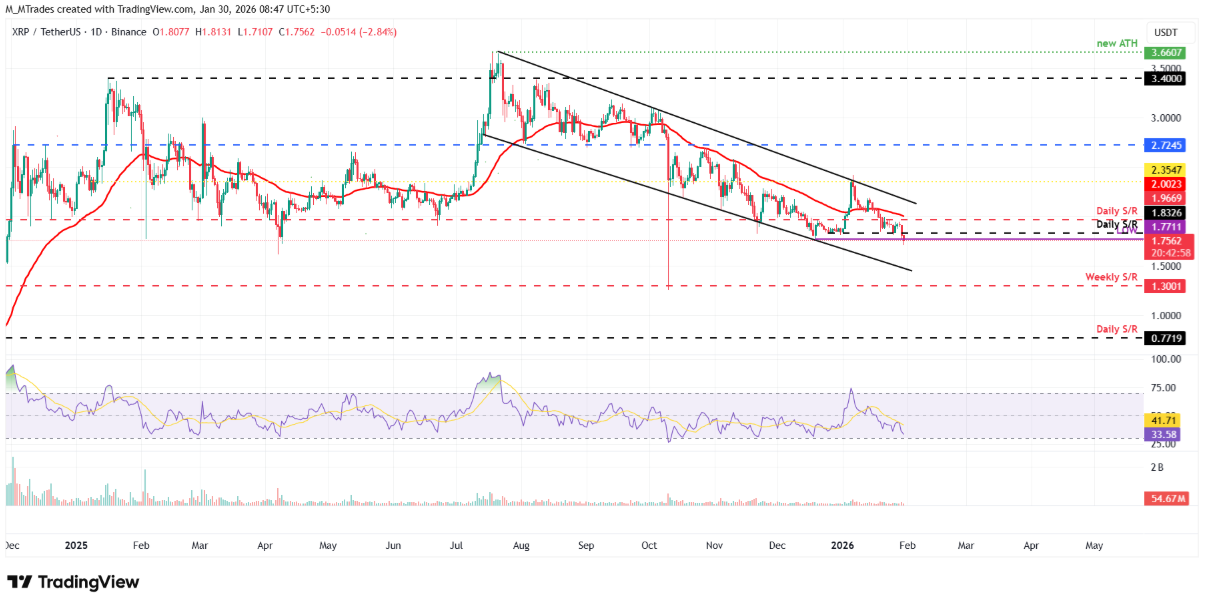 Giá XRP đã không thể bứt phá và đóng cửa trên ngưỡng kháng cự ngày 1,96 USD trong phiên thứ Tư. Áp lực bán gia tăng ngay sau đó đã kéo giá giảm 5,42% trong phiên kế tiếp, khiến XRP đóng cửa dưới vùng hỗ trợ quan trọng tại 1,83 USD. Đến thứ Sáu, đồng coin này tiếp tục trượt xuống 1,75 USD — mức thấp nhất kể từ giữa tháng 10.