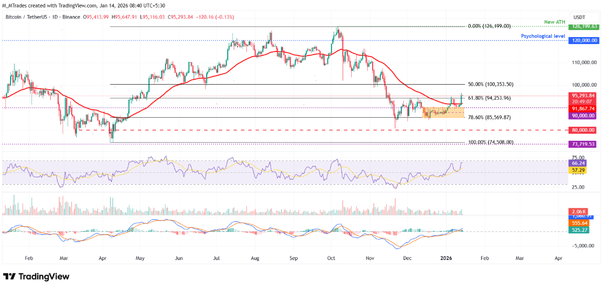 Giá Bitcoin đã cho thấy tín hiệu vững vàng khi bật tăng trở lại từ kháng cự của phạm vi mà giá đã bứt phá trước đó, quanh mốc 90.000 USD vào ngày 8/1. Sau nhịp phục hồi nhẹ kéo dài đến hết phiên thứ Hai, đà tăng được củng cố rõ rệt trong phiên thứ Ba khi BTC bật tăng hơn 4% và đóng cửa phía trên mức Fibonacci thoái lui 61,8% — tính từ đáy tháng 4 tại 74.508 USD đến đỉnh lịch sử tháng 10 ở 126.199 USD — tương ứng ngưỡng 94.253 USD. Sang phiên thứ Tư, Bitcoin tiếp tục duy trì giao dịch ổn định quanh vùng 95.300 USD.