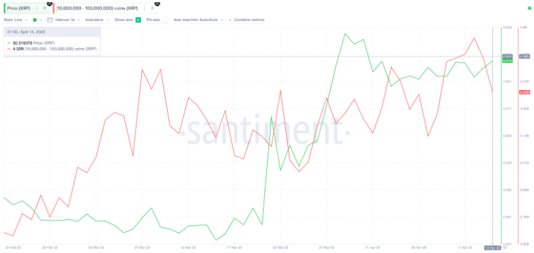 Giá XRP vs phân phối nguồn cung cá voi tháng 4 năm 2023. Nguồn: Santiment
