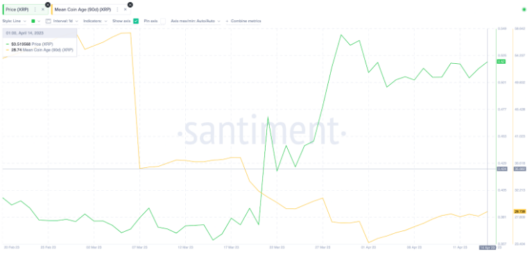 Giá XRP vs tuổi coin trung bình tháng 4 năm 2023. Nguồn: Santiment