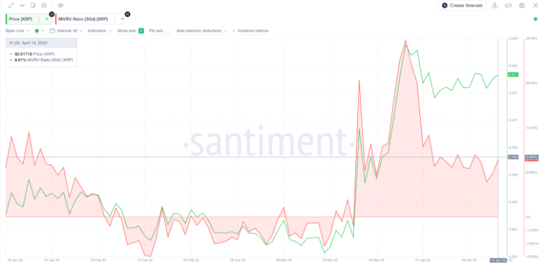 Biểu đồ MVRV (30d) của XRP tháng 4 năm 2023. Nguồn: Santiment