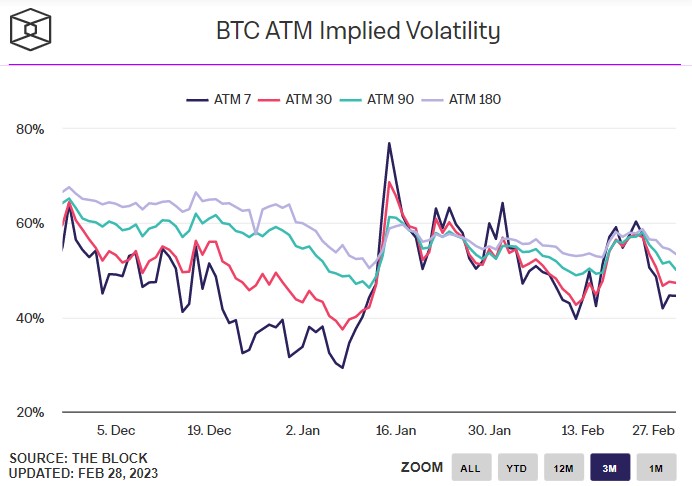 Mặt khác, biến động tiềm ẩn theo định giá của các quyền chọn At-The-Money (ATM) cũng đang trượt dốc, dẫn đến dự đoán biến động ngắn hạn giảm mạnh nhất. Theo dữ liệu được The Block trình bày, biến động tiềm ẩn trong 7 ngày của Bitcoin ở mức 44,55%, giảm từ 60,33% vào thời điểm này của tuần trước. Biến động tiềm ẩn trong 30, 60 và 180 ngày cũng lao xuống 47%, 50% và 53,5% từ mức tương ứng là 57%, 58% và 58% vào thời điểm này của tuần trước.