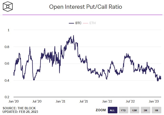 Xét những gì mà thị trường quyền chọn đang nói về triển vọng của Bitcoin, bức tranh vẫn chưa rõ ràng. Một mặt, tỷ lệ giữa hợp đồng mở (OI) quyền chọn bán (put) thường có xu hướng giảm và quyền chọn mua (call) thường có xu hướng tăng chắc chắn nghiêng về call và gần như ở mức kỷ lục. Cụ thể, tỷ lệ OI put/call là 0,42 gần đây nhất, cao hơn một chút so với mức thấp kỷ lục mà nó đạt được vào đầu tháng này là 0,39.
