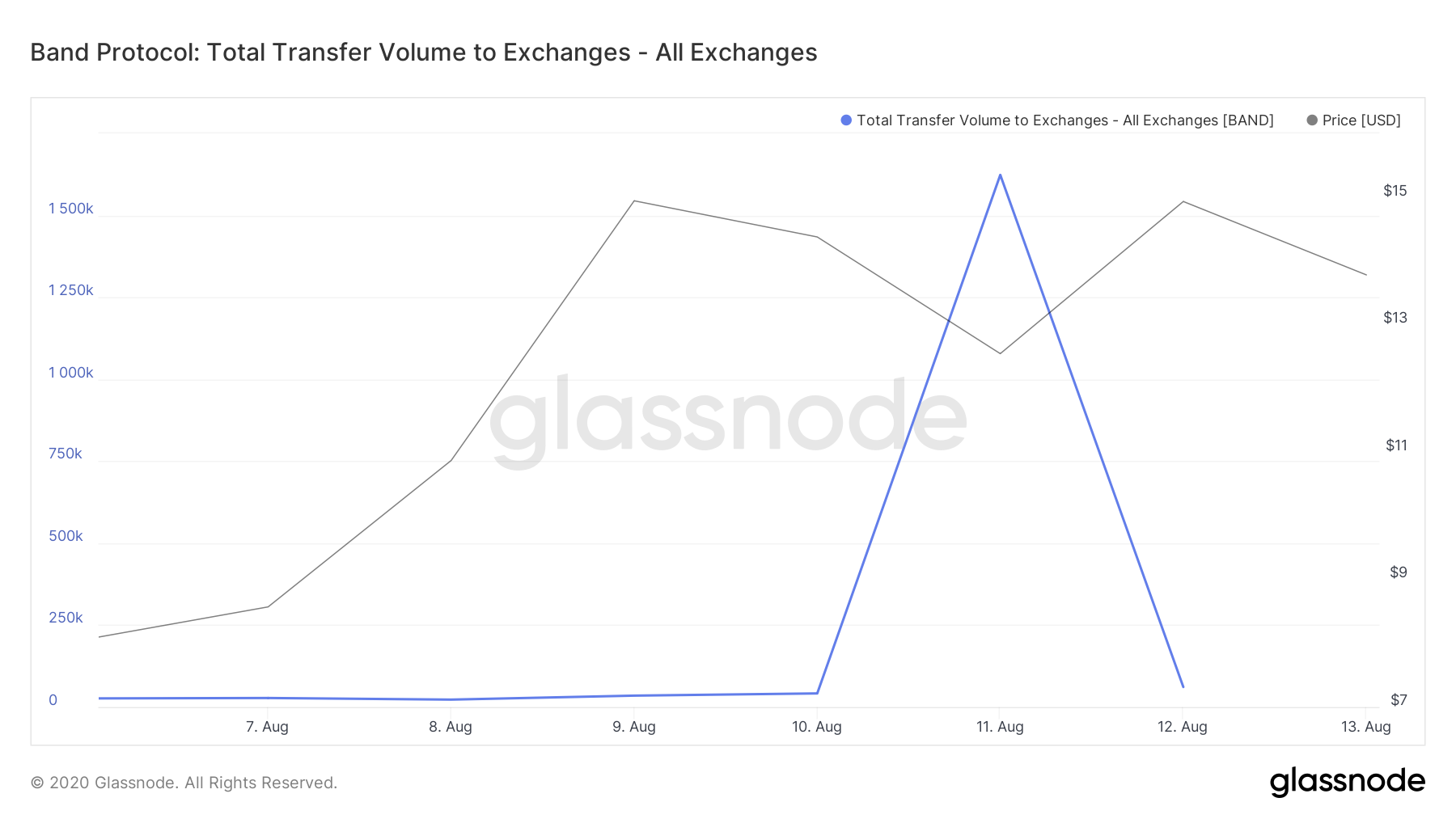 Glassnode, nền tảng dữ liệu và tình báo on-chain, tiết lộ hơn 1,6 triệu BAND đã được chuyển đến các sàn giao dịch khác nhau vào ngày 11/8. Tăng đột biến tiền gửi vào sàn có thể được coi là dấu hiệu của áp lực bán.