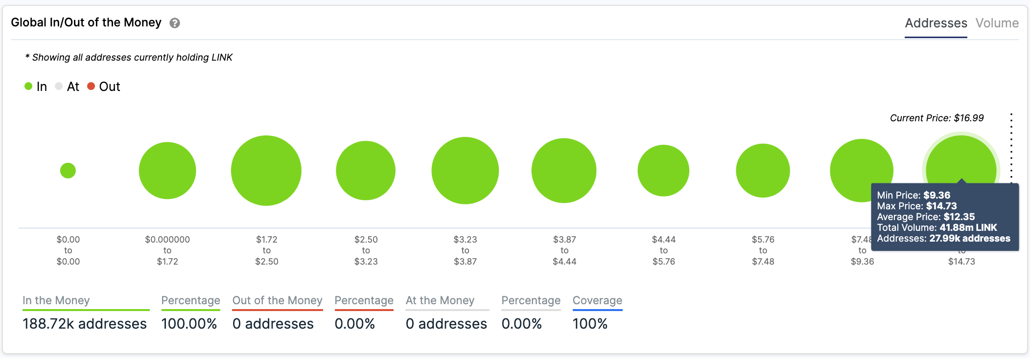 Trong trường hợp điều chỉnh, mô hình “Tiền vào/ra toàn cầu” (GIOM) của IntoTheBlock tiết lộ có tường cung quan trọng bên dưới LINK mà có thể giữ được. Dựa trên số liệu on-chain này, khoảng 28.000 địa chỉ trước đây đã mua gần 42 triệu LINK với giá khoảng 12,35 đô la.