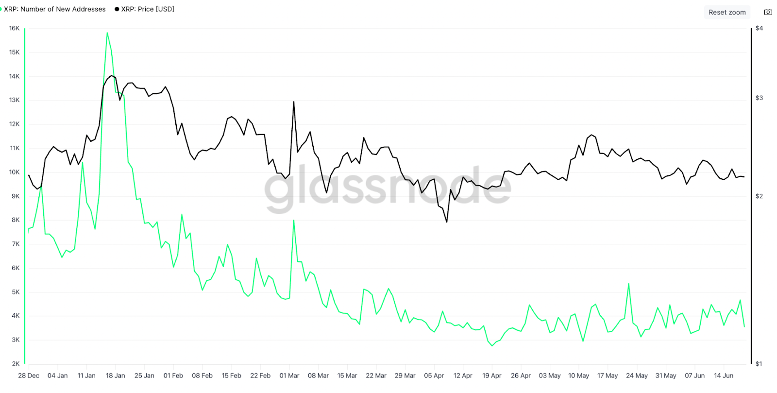 XRP Ledger sụt giảm đáng kể hoạt động mạng trong 6 tháng qua. Dữ liệu on-chain từ Glassnode cho thấy số lượng địa chỉ mới mỗi ngày trên mạng đã giảm mạnh so với đỉnh cao 15.823 địa chỉ vào ngày 16/1/2025. Vào thứ 5, chỉ có 3.500 địa chỉ mới được tạo ra.