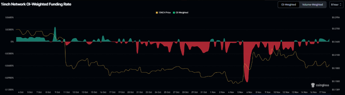 Các chỉ số phái sinh cũng ủng hộ đà phục hồi này. Theo Coinglass, Tỷ lệ funding rate cho thấy số lượng trader đặt cược giá 1INCH giảm thấp hơn so với những người dự đoán giá tăng. Chỉ số này đã chuyển sang mức tích cực vào thứ Hai và duy trì ở 0,0070% vào thứ Năm, ám chỉ những người nắm giữ vị thế Long đang trả phí cho bên short. Lịch sử ghi nhận rằng, khi tỷ lệ này chuyển từ âm sang dương, 1INCH thường có xu hướng tăng mạnh.