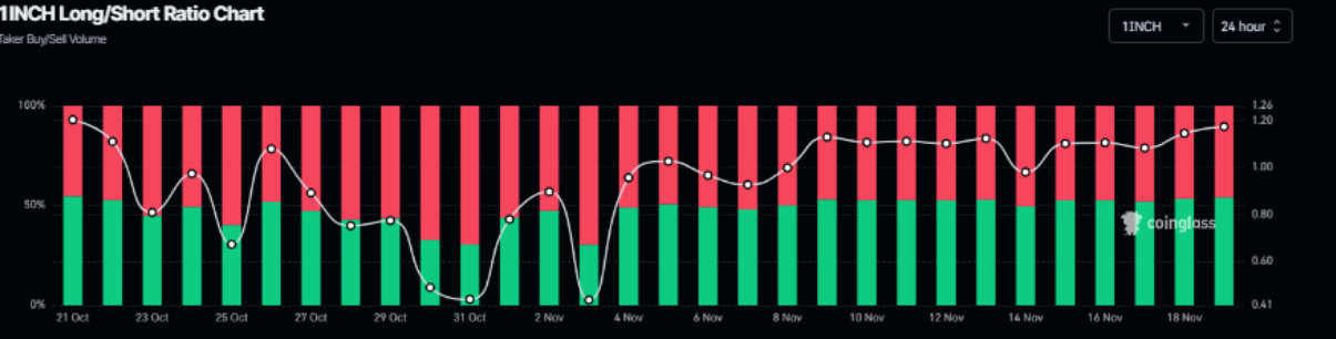 Thêm vào đó, tỷ lệ long/short của 1INCH hiện đang ở mức 1,17 — mức cao nhất trong hơn một tháng, cho thấy đa số trader hiện đang đặt cược giá 1INCH sẽ tiếp tục đi lên.
