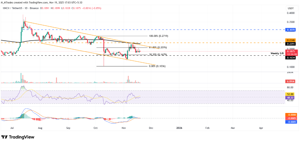 Ngược lại, nếu 1INCH chịu áp lực điều chỉnh, giá có thể kéo dài đà giảm về mức hỗ trợ quan trọng tiếp theo trên khung tuần tại 0,163 USD.