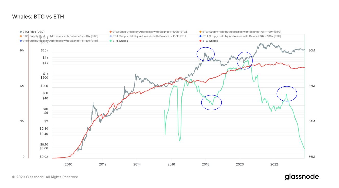 Tuần này, các nhà quan sát đã nhận thấy sự tương phản rõ rệt giữa các hodler lớn của hai loại tiền điện tử hàng đầu trên thị trường – làm nổi bật tâm lý dường như trái ngược giữa những con cá voi đối với Bitcoin và Ethereum. Theo công ty phân tích onchain Glassnode, những con cá voi Ethereum nắm giữ 1.000 ETH trở lên (trị giá khoảng 1,5 triệu USD) đã có xu hướng giảm mạnh kể từ năm 2020, với 20 triệu đô la ETH bị bán tháo.