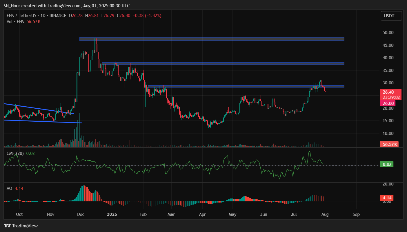 Trong bối cảnh đó, khả năng phe gấu lấy lại quyền kiểm soát thị trường hoàn toàn có cơ sở. Tín hiệu cảnh báo đầu tiên cho kịch bản này sẽ là nếu giá ENS trượt xuống dưới ngưỡng hỗ trợ $26,15 — một mốc quan trọng mà nếu bị xuyên thủng, sẽ mở đường cho đà giảm sâu hơn. Phe bò buộc phải thể hiện sức mạnh rõ ràng và dứt khoát hơn nếu muốn giữ thế cân bằng.