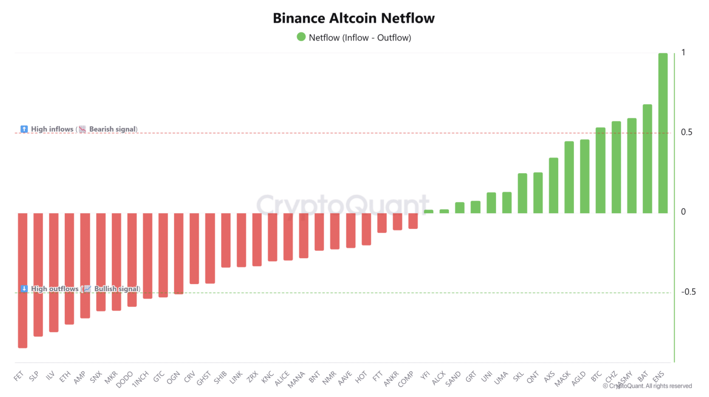 Biểu đồ dòng tiền ròng (netflow) vào sàn Binance cho thấy Ethereum Name Service (ENS) đang ghi nhận mức vốn đổ vào trung bình 7 ngày cao nhất – sau khi đã được chuẩn hóa.