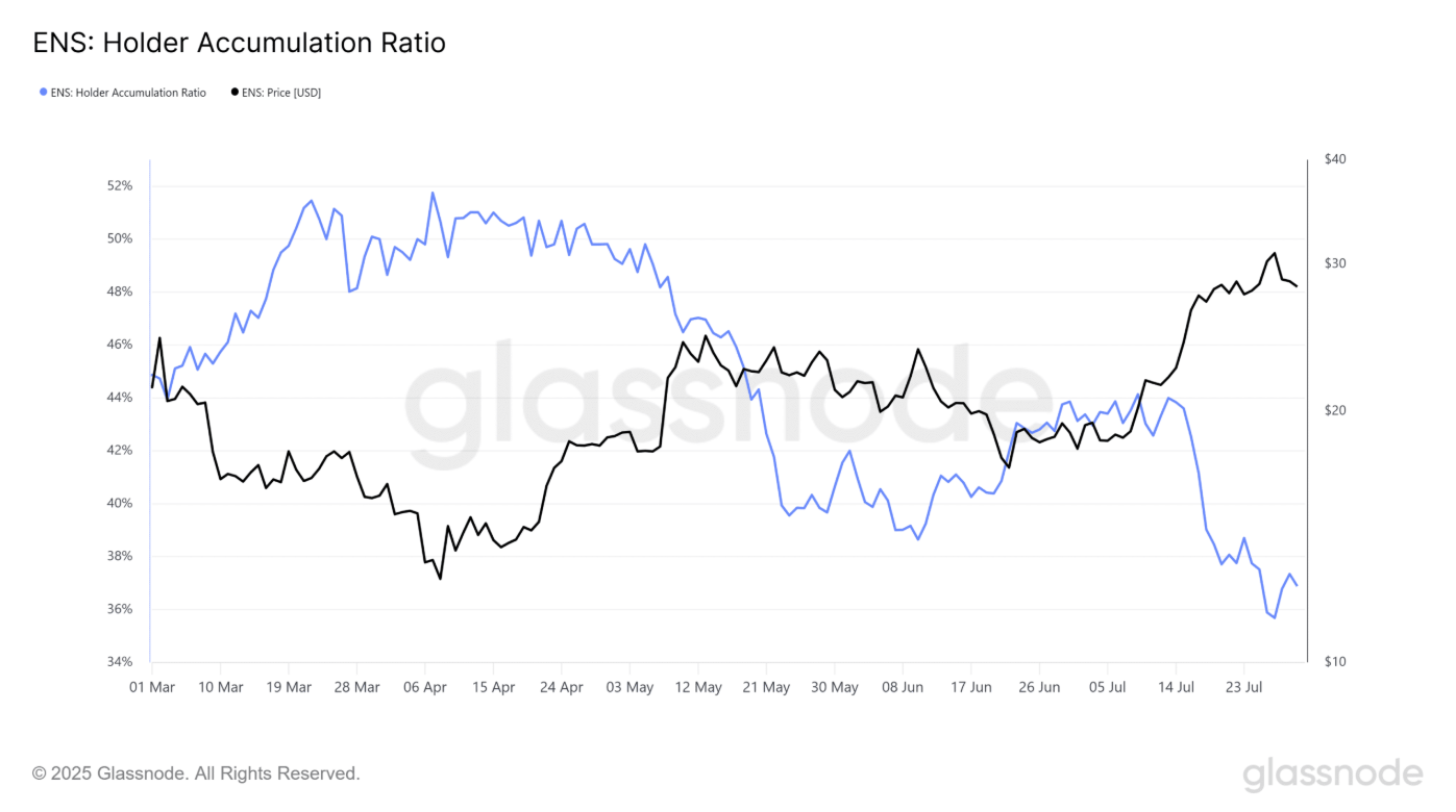 Đáng lo ngại hơn, tỷ lệ tích lũy của holder ENS – chỉ báo phản ánh việc các nhà đầu tư đang gia tăng hay thu hẹp vị thế – cũng đang trên đà suy giảm.