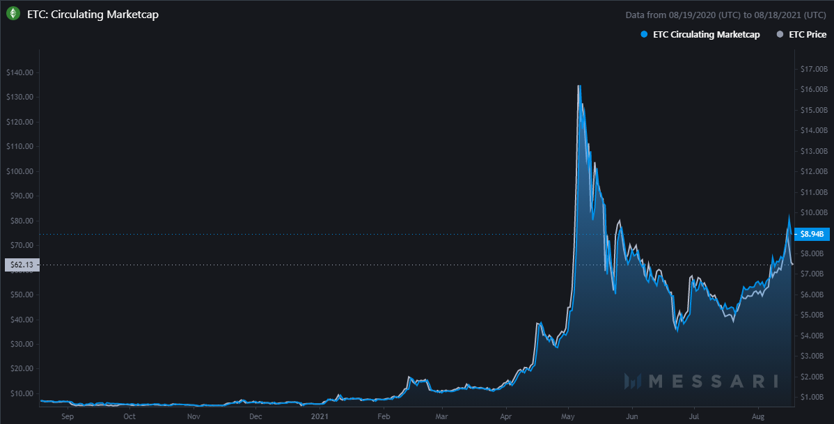 Vốn hóa thị trường lưu hành của ETC cũng vậy, tăng từ 5,39 tỷ lên 8,94 tỷ đô la chỉ trong một tháng. Đây là dấu hiệu cho thấy lượng lớn token có sẵn công khai ở giai đoạn này và đang lưu thông trên thị trường.